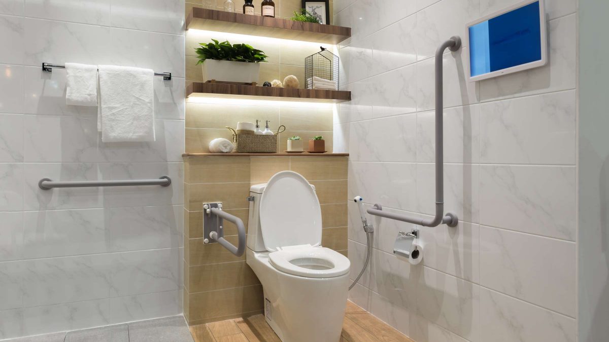 Interior of bathroom for the disabled or elderly people. Handrail for disabled and elderly people in the bathroom